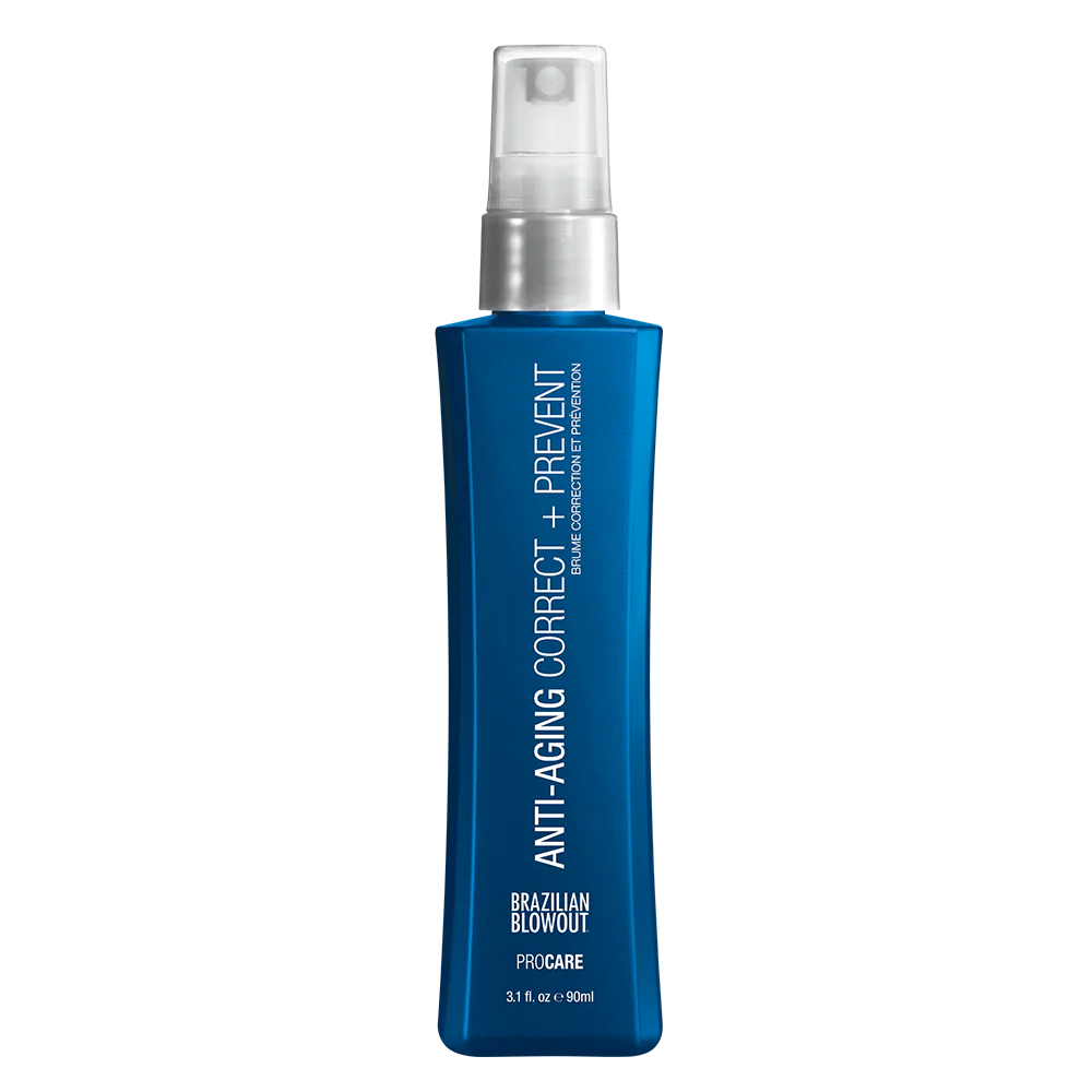 Anti-Aging Correct + Prevent is a color-safe micro reparative system that instantly corrects and prevents the signs of aging as it restores the look + feel of younger hair. Utilizing smart technology, clinically proven actives and isolated plant proteins fill in and rebuild weakened fibers from within, repairing years of damage that can cause hair to prematurely age. A protective polymer significantly reduces breakage and blow dry time as it combats frizz and calms wiry grays. Strands are strengthened, feel silky and appear years younger. With continued use hair is more youthful, humidity is neutralized and color retention is improved. Guarantees the longevity of the Brazilian Blowout REWIND Anti-Aging Reparative Service.*
